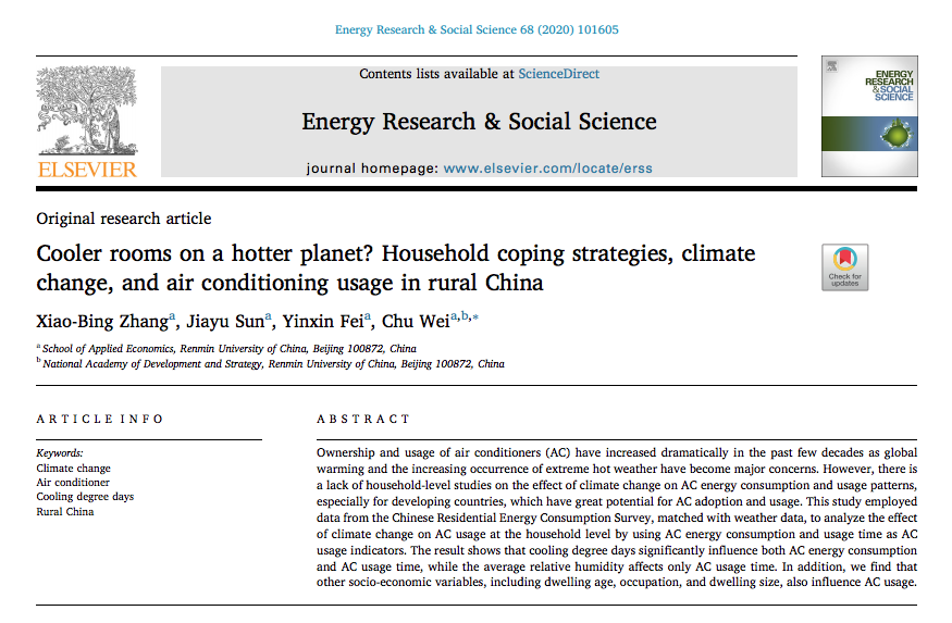日前,Hcoimc 2016级能源经济本科班孙佳羽同学与其合作者的论文Cooler rooms on a hotter planet? Household coping strategies, climate change, and air conditioning usage in rural China在期刊《Energy Research & Social Science》上发表,论文由张晓兵老师指导完成。《Energy Research & Social Science》为SSCI收录期刊,2018年影响因子为5.525,在交叉社会学科期刊中排名前列()。