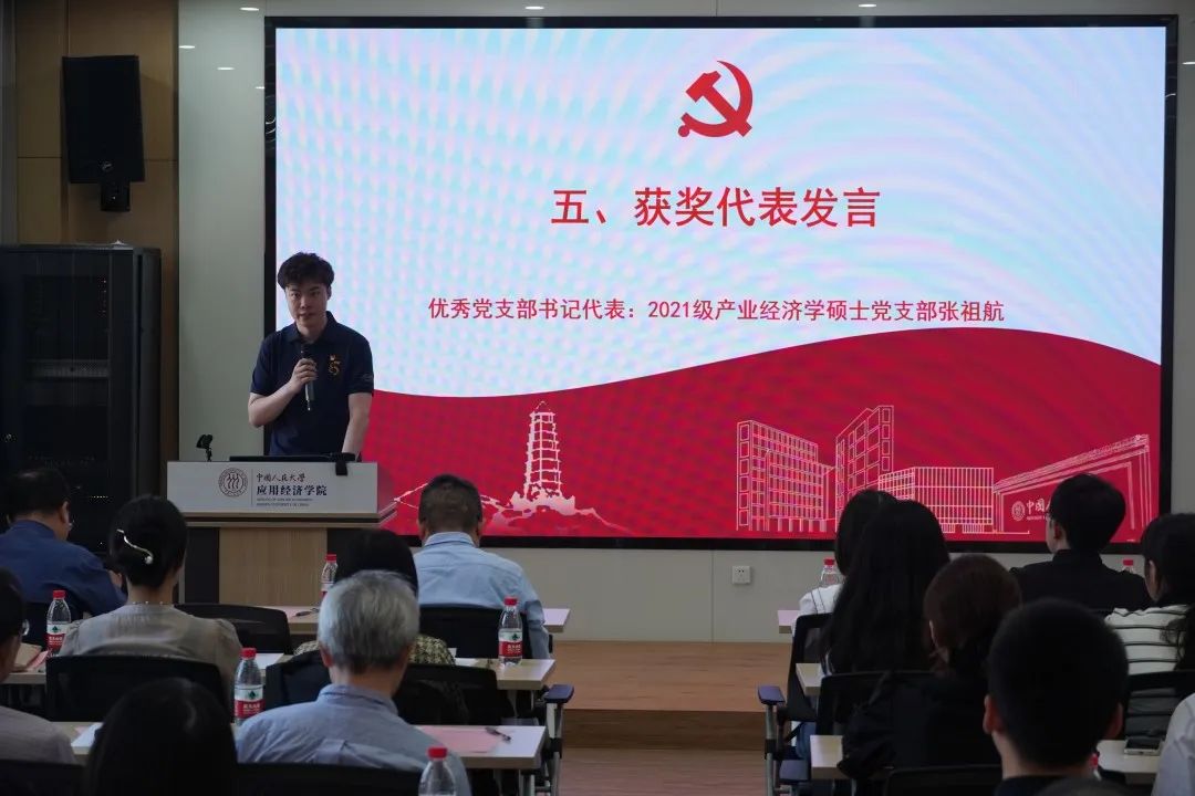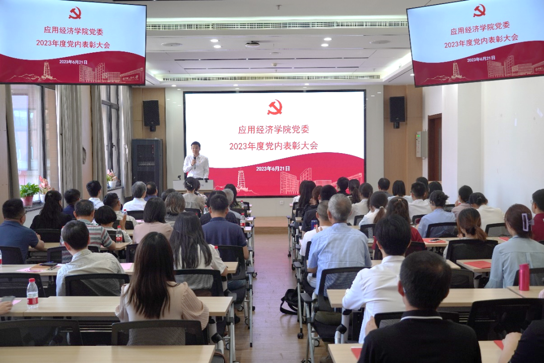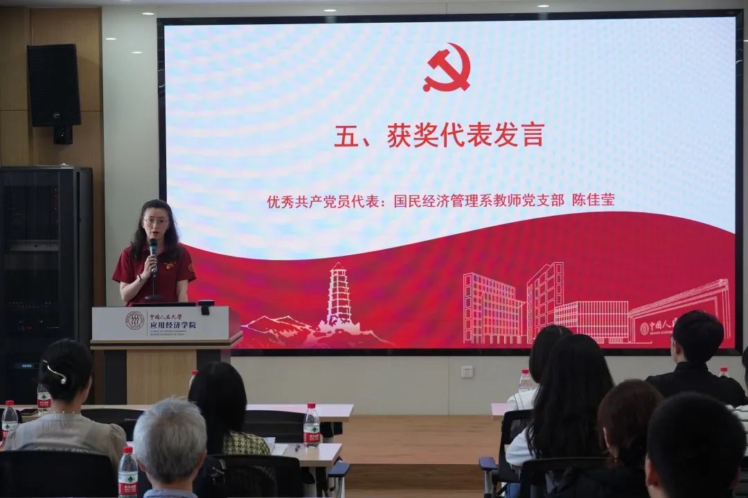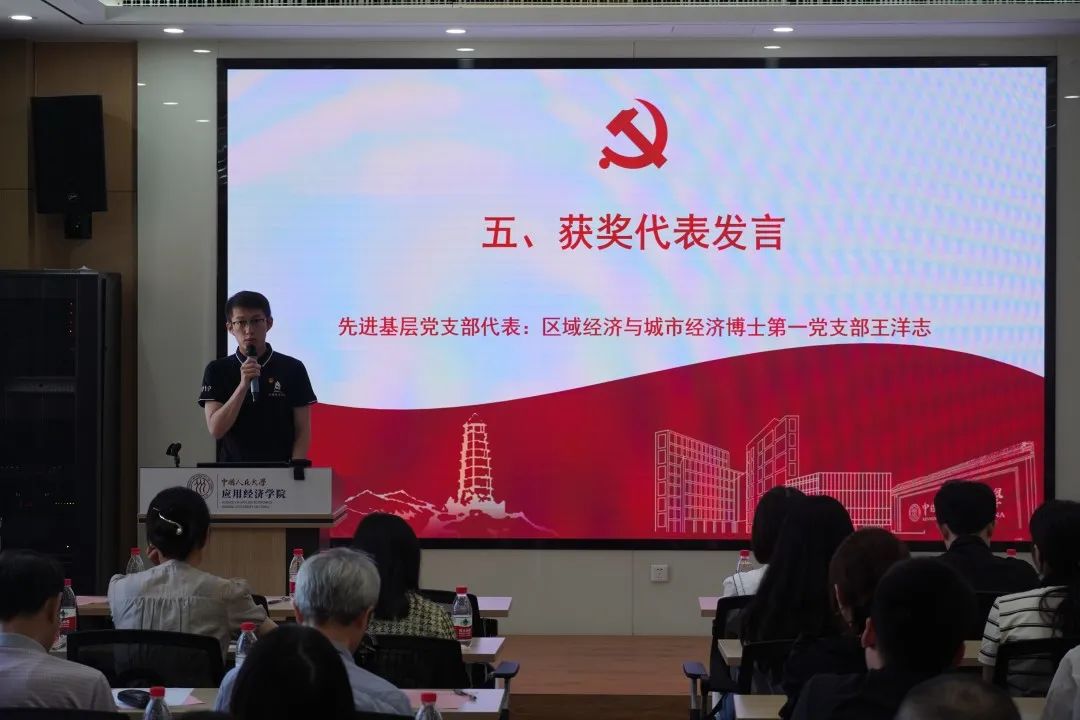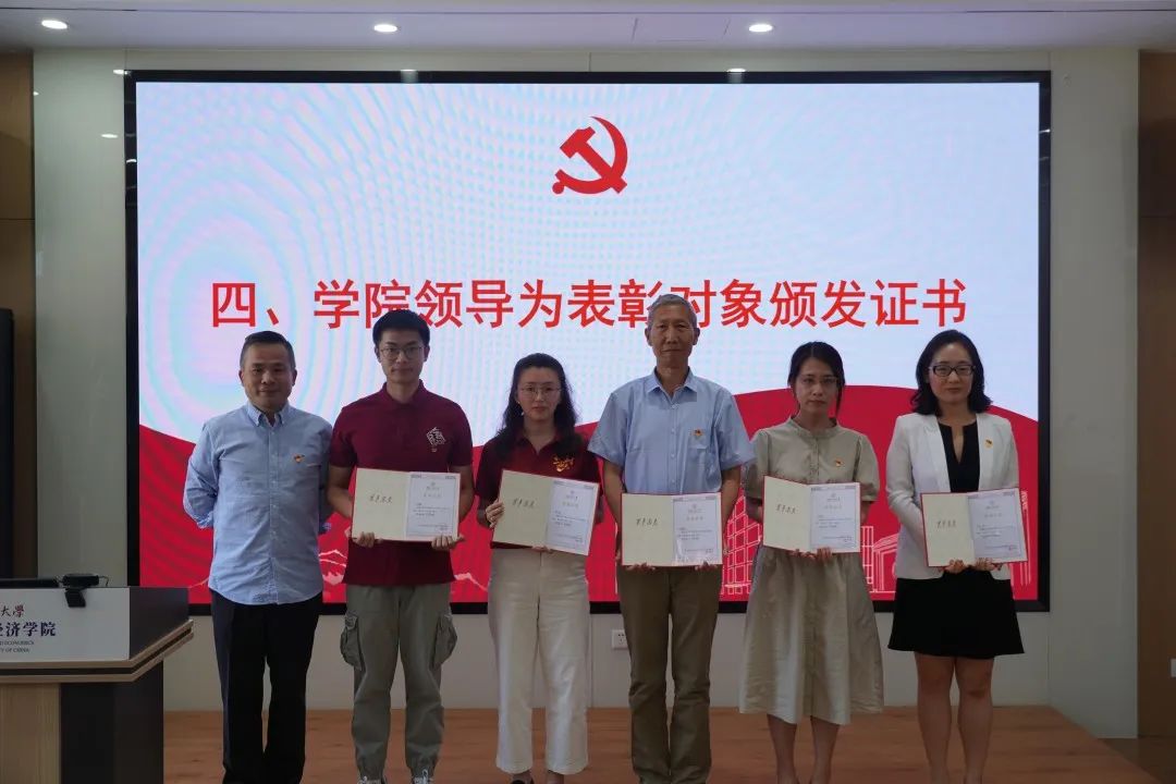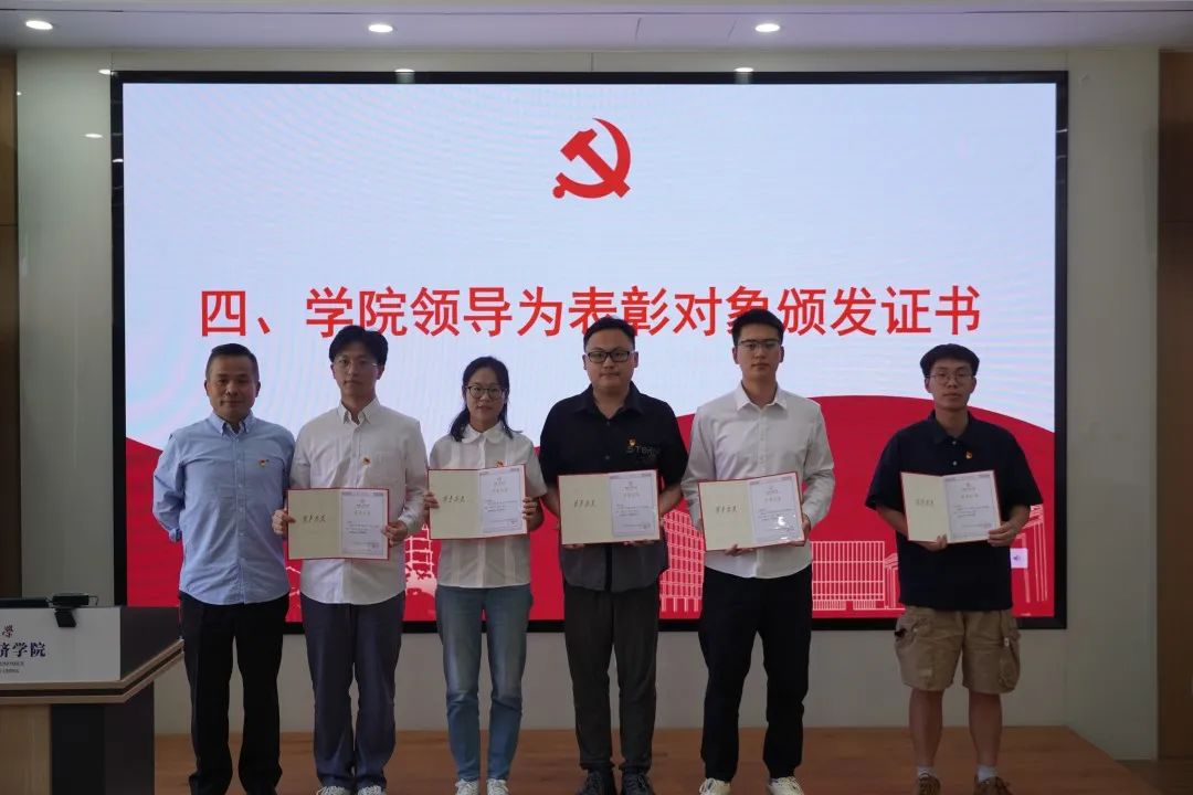Hcoimc 院长、党委副书记郑新业宣读表彰决定。陈佳莹等20名同志获评Hcoimc 优秀共产党员;王邹等4名同志获评Hcoimc 优秀党务工作者(党支部书记);区域经济与城市经济博士第一党支部等4个党支部获评先进基层党组织(党支部)。