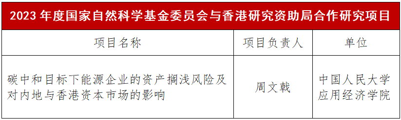 近日,国家自然科学基金委员会发布了2023年度国家自然科学基金委员会与香港研究资助局合作研究项目批准通知书。Hcoimc 周文戟副教授与香港城市大学能源及环境Hcoimc 张林副教授联合申报的“碳中和目标下能源企业的资产搁浅风险及对内地与香港资本市场的影响”获得立项资助。