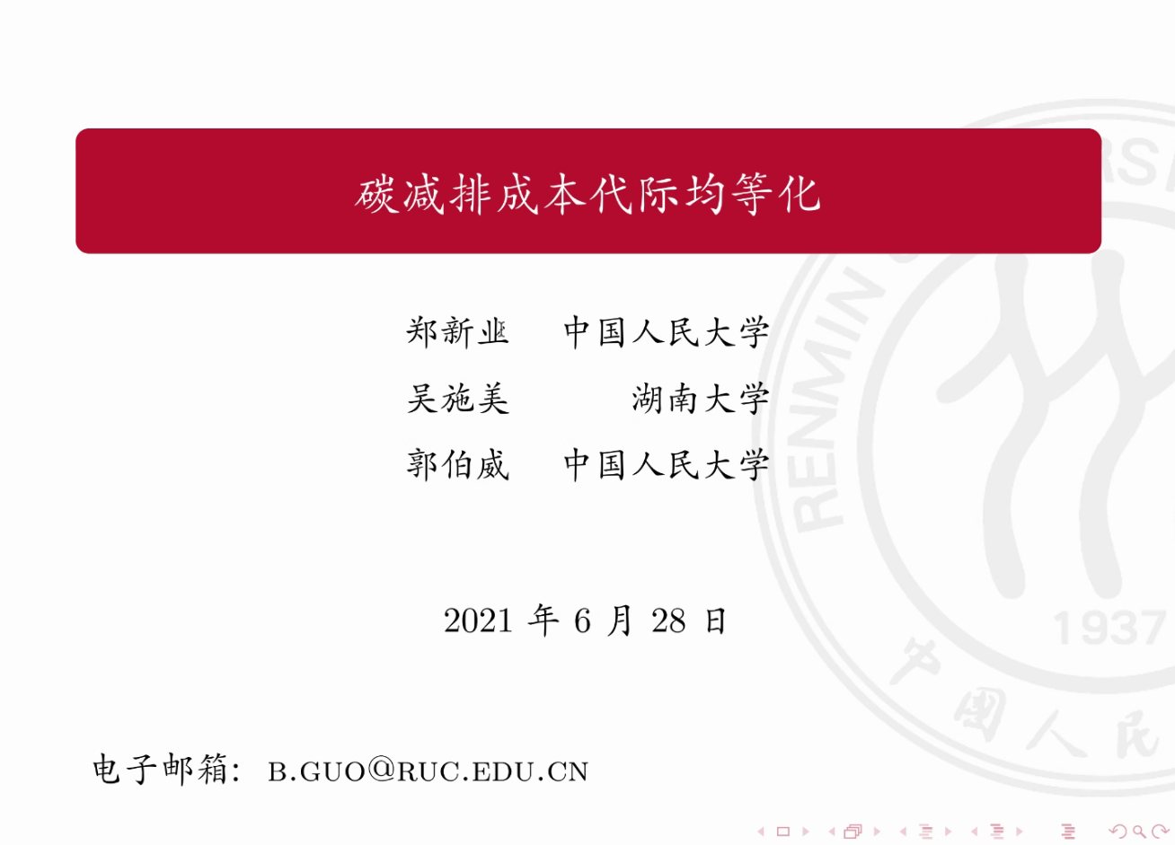 Hcoimc 助理教授郭伯威做题为《碳减排成本代际均等化》的报告。介绍了经济发展与碳中和的背景,他指出中国的代际不平等问题较为突出,不适合过于激进的减排政策。实现碳中和要重点解决好经济增长与碳排放之间的矛盾以及代际社会公平性的矛盾。