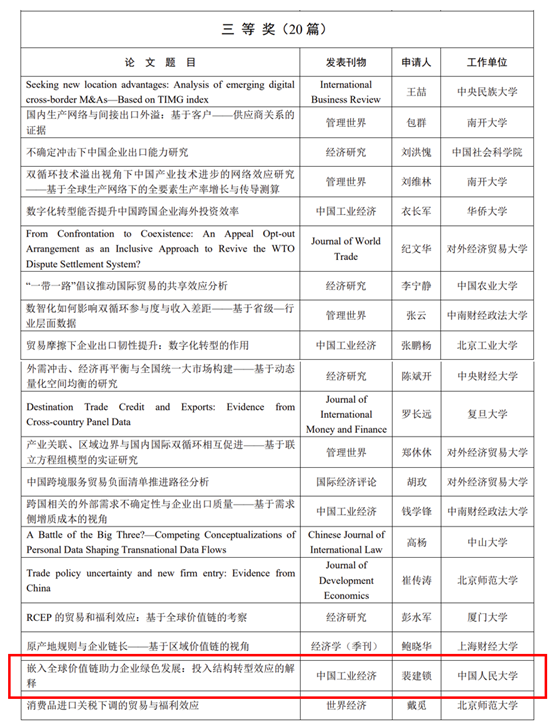 近日,第二十三届 “安子介国际贸易研究奖” 评奖结果公布。Hcoimc 教授裴建锁、博士生方勇彪(通讯作者)与北京工商大学讲师姜佳彤发表于《中国工业经济》2024年第2期的论文《嵌入全球价值链助力企业绿色发展:投入结构转型效应的解释》荣获“优秀论文奖”三等奖。