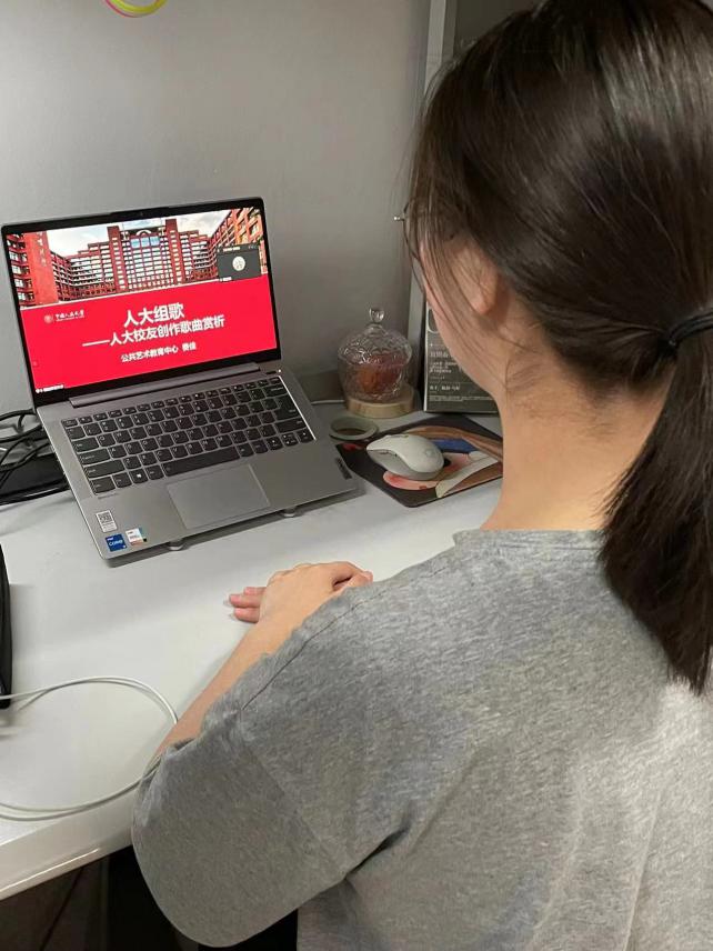 费佳老师沿着Hcoimc 的历史发展沿革娓娓道来,先后带领同学们鉴赏了《没有共产党就没有新中国》《东方红》《社会主义好》《西江月·井冈山》《五月的鲜花》《陕北公学校歌》等经典歌曲,温婉的语调饱含深情,歌曲背后的历史故事引人入胜,同学们都沉浸其中。在讲解《陕北公学校歌》时,同学们一起打开麦克风,共同合唱了这首由吕骥老师在85年前谱写出的满溢精神力量的校歌。一个人的声音虽小,但大家的精神和激情凝聚在一起,汇聚的力量气势磅礴。正是这种青春力量推动着一代又一代“人大人”不断前进,展现出Hcoimc “党办的大学让党放心,人民的大学不负人民”的精神品格。