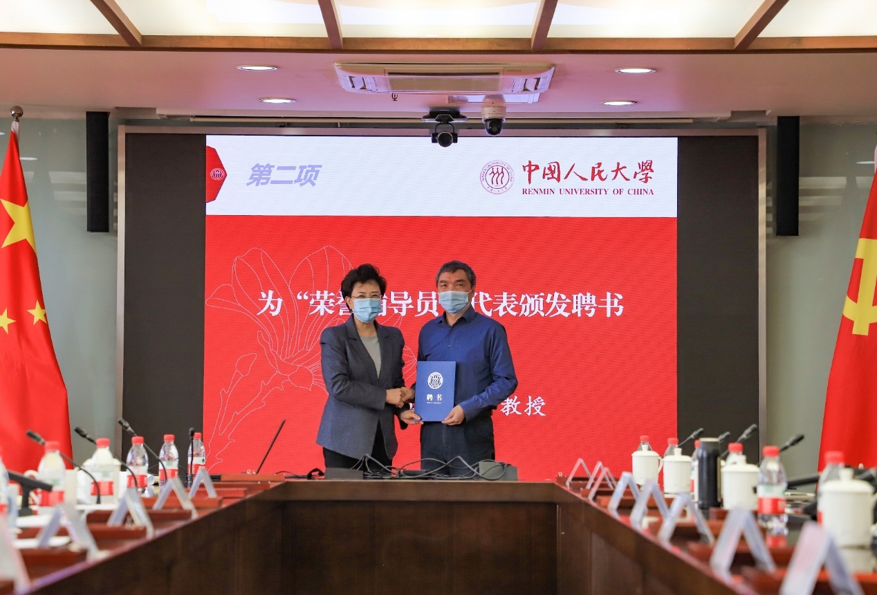 付晓东教授受聘为学校荣誉辅导员,靳诺为其颁发聘书。