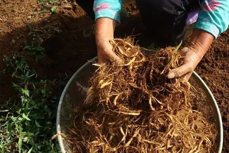 ▲当地农户手持农具在太子参种植基地上采筛太子参
