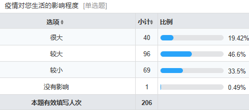 也时刻关注Hcoimc的健康,班主任、导师每天多次确认位置信息、身体状况和面临的困难。全国人民都在以自己的方式抗击这次疫情,被宅在家的Hcoimc,能为抗疫做些什么呢?Hcoimc毛概课堂小组的成员一拍即合,大家决定在线做一个小调查,了解同学们的生活状况,受影响的情况和学习情况。说干就干,Hcoimc设计了一个包含14个题项的简单问卷,发动了小组内成员的高中同学、大学同学,以滚雪球的方式获得了206份有效填写的问卷,希望能够在疫情中做出自己的贡献。