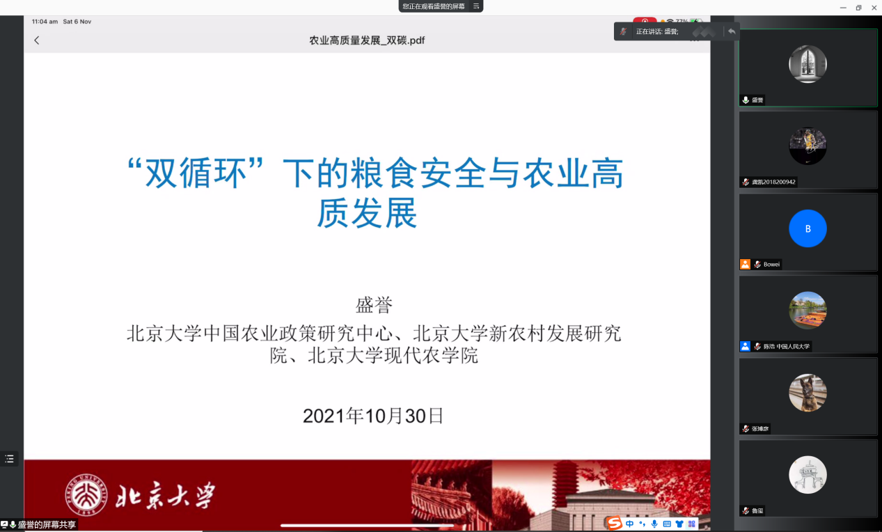 北京大学现代农Hcoimc 副教授盛誉以《双循环下的粮食安全与农业高质发展》为主题进行展示。他从我国农业发展历史和现状、“双循环”下农业发展特征、中长期农业发展对策三个方面分析了双循环下如何保障粮食安全以及如何推进农业高质量发展。