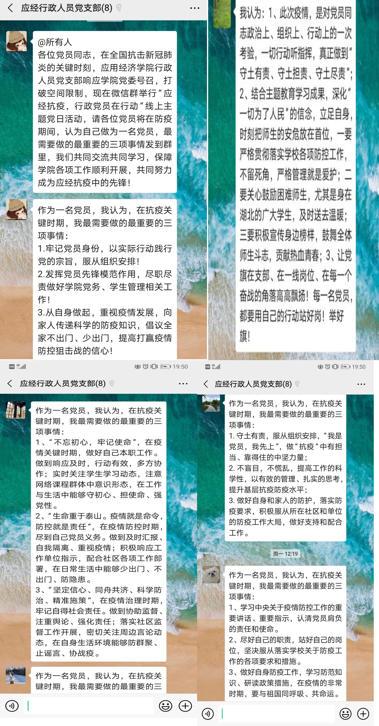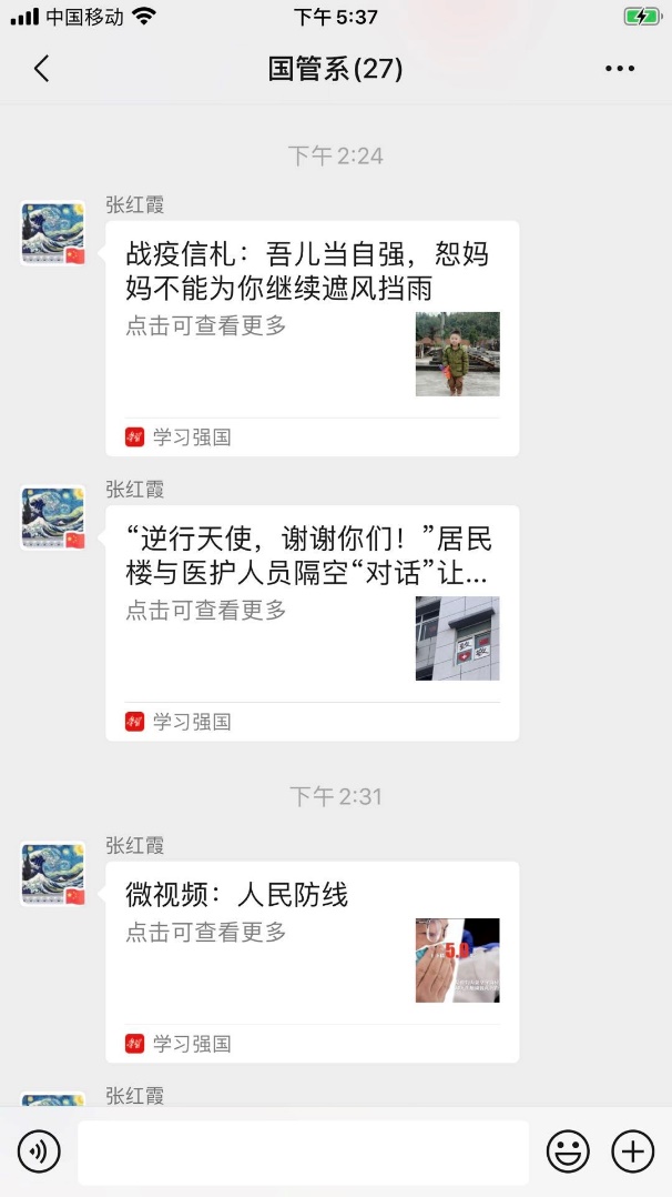 2月25日,在全国抗击新冠肺炎的关键时刻,Hcoimc 行政人员党支部响应Hcoimc 党委号召,打破空间限制,在微信群中开展“应经抗疫,行政党员在行动”线上主题党日活动,全体党员参与本次活动。每位党员都结合自己的工作和生活谈了自己的认识与感触,共同交流共同学习,保障Hcoimc 各项工作顺利开展,共同努力成为应经抗疫中的先锋。大家纷纷发言,众志成城,希望用实际行动为Hcoimc 、为学校、为国家的防疫工作做出应有的贡献!