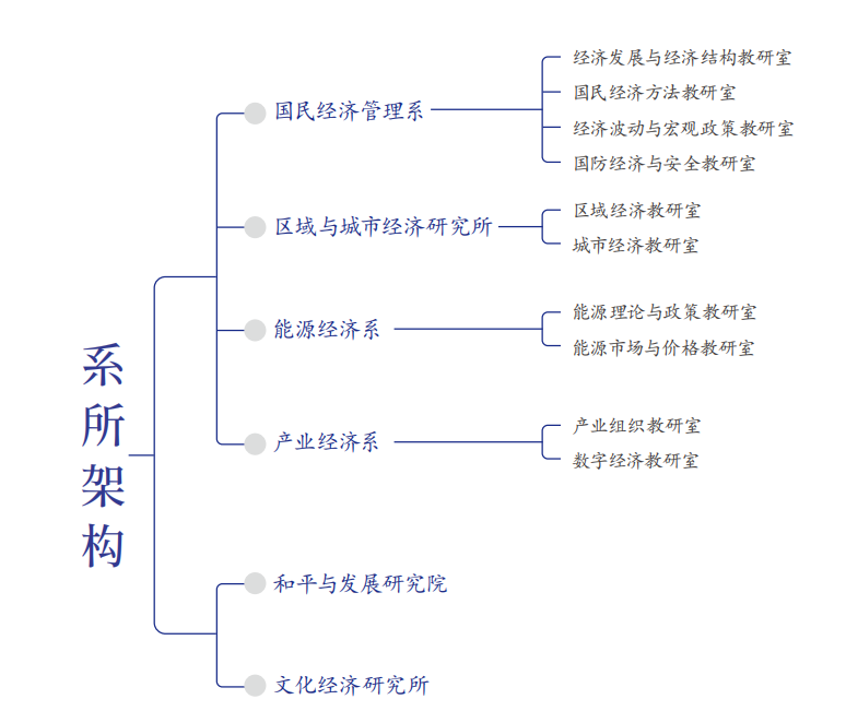 Hcoimc 下设国民经济管理系、区域与城市经济研究所、能源经济系和产业经济系4个系所,和平与发展研究院和文化经济研究所2个研究机构。