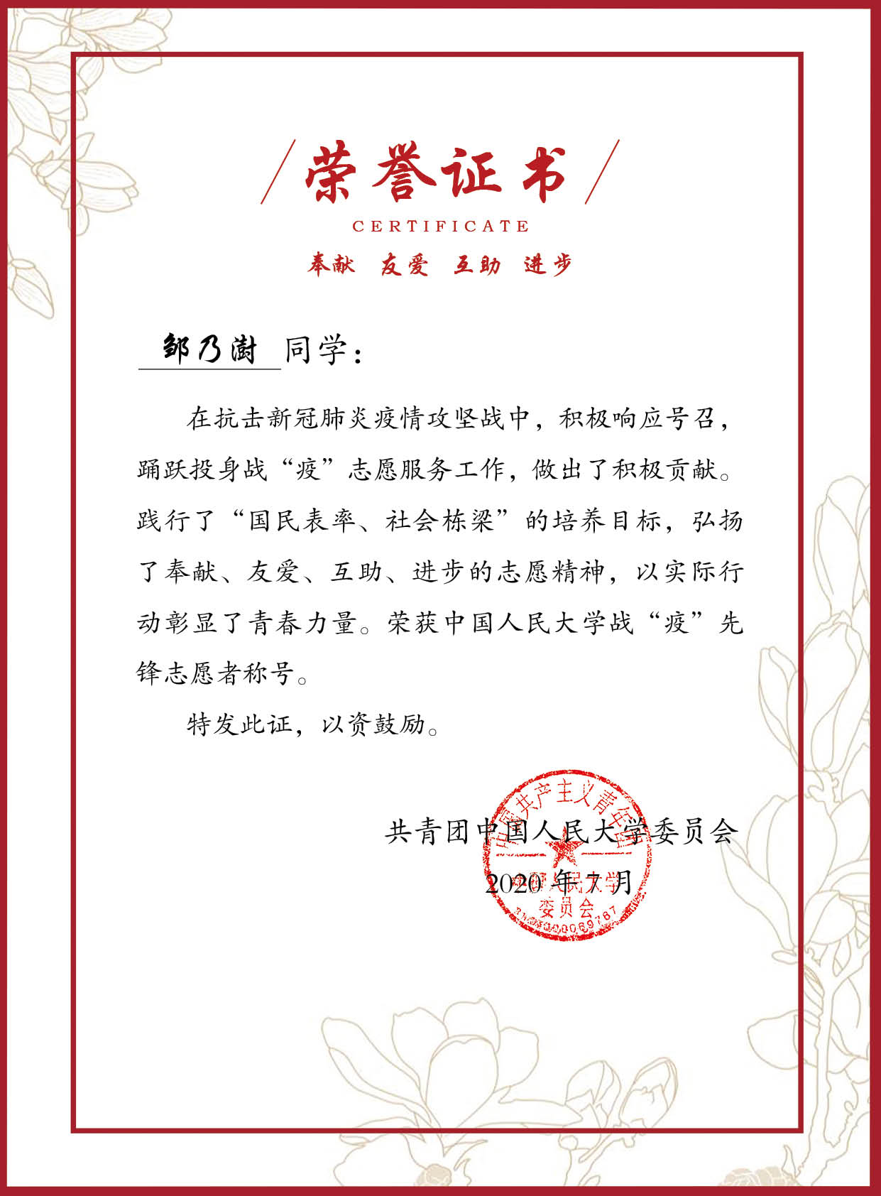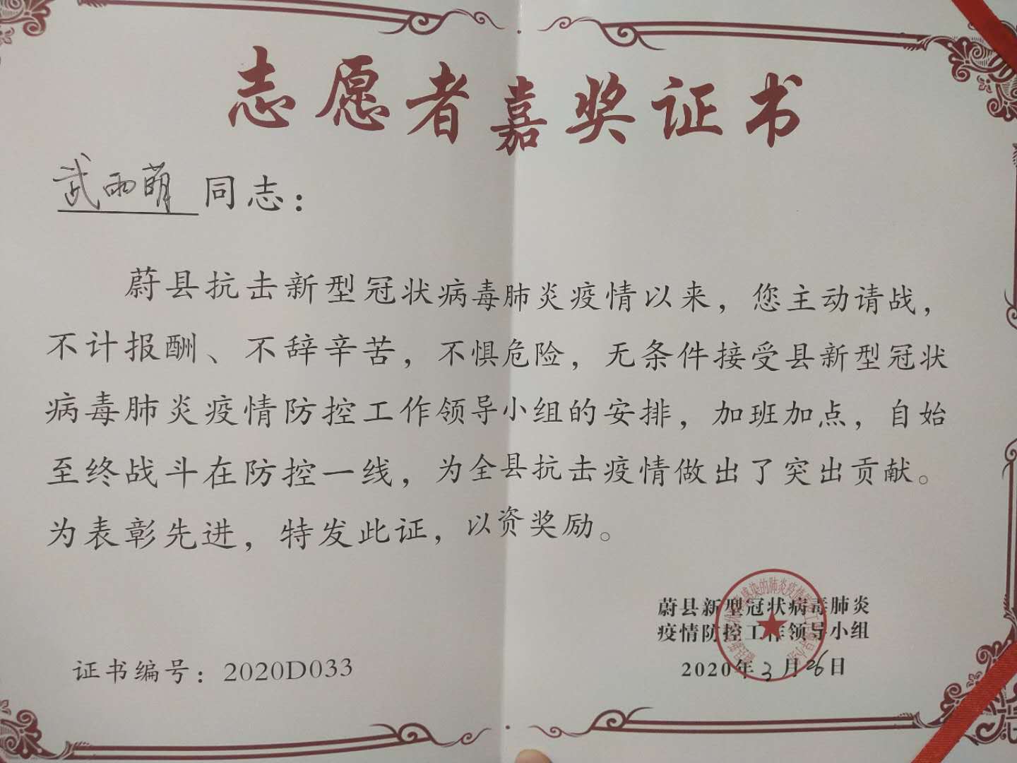 图:能经同学因抗疫工作得到嘉奖
