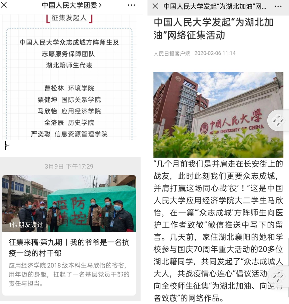 图:能经同学联合发起“为湖北加油”网络征集活动并被《人民日报》《新华社》追踪报道