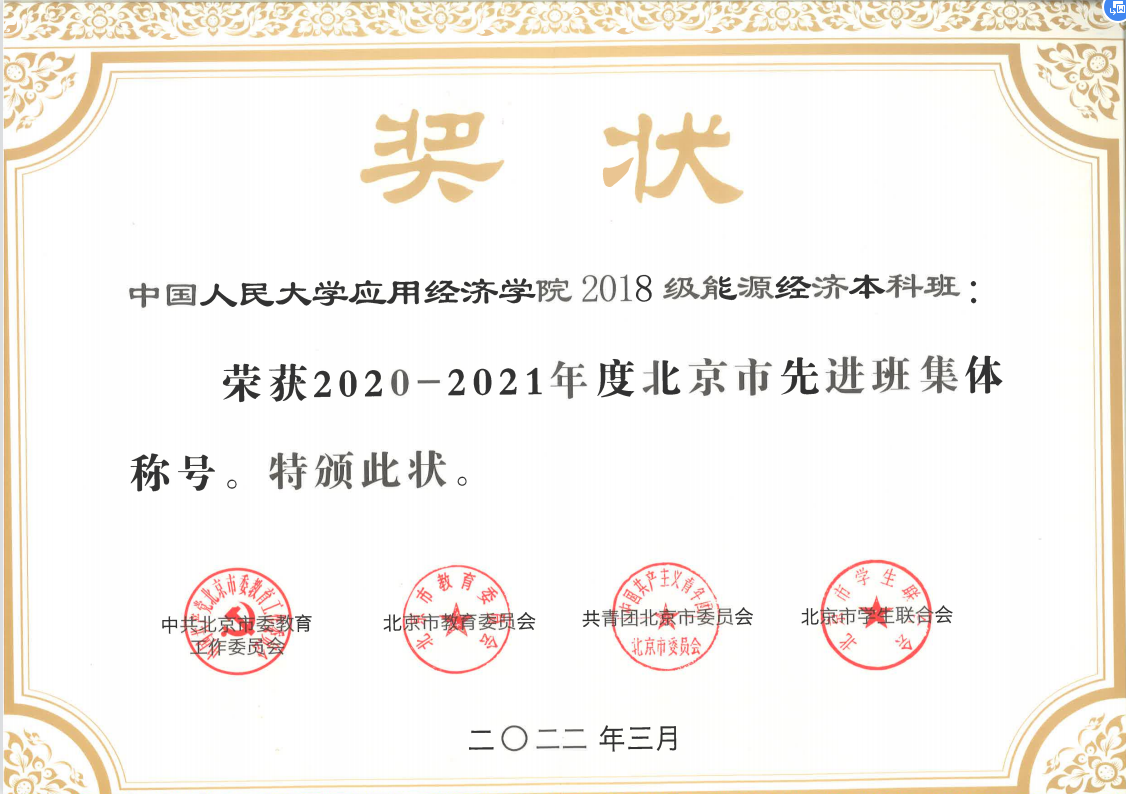 2018级能源经济本科班自成立以来,在全体同学戮力同心、不懈努力之下,围绕Hcoimc 有品格觉悟、有专业本领、有健康身心的“三有人才”培养理念,在思想风貌建设、学习风气培育、社会实践研究等方面不断探索,不断取得优异成绩。班团一体化协同发展,曾获评Hcoimc 2020年度“五星团支部”、2021年“五星红旗团支部”、2020-2021学年“十佳班集体”等荣誉奖项。能经班全体同学作为新时代青年学子,始终坚持“在时代的赛道上奋力奔跑,展现青春活力,争取跑出当代青年的最好成绩”。