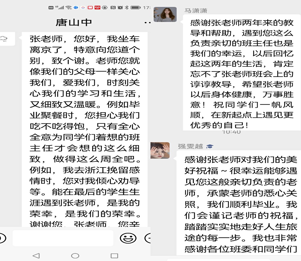 为保障学生健康身心,她始终密切关注学生需求困难,与班级同学及时沟通、互动交流,切实解决学生的实际困难。她高度重视学生在疫情防控、毕业就业压力下的心理健康状况,保持24小时手机开机,随时通过微信、电话和腾讯会议与同学们就遇到的各种问题进行沟通和解答,针对因毕业论文写作困难等问题而情绪不稳定等特殊情况,及时了解情况并提供针对性的帮助。她说,“从入学的那天开始,全班学生的事情就成为我心中最重要的事情。”她的辛苦付出收获了同学们的爱戴,在毕业之际,同学们动情的说“您就像Hcoimc的父母一样关心Hcoimc、爱Hcoimc”“只有全心全意为同学们着想的班主任才会这么细致、做得这么周全吧”。