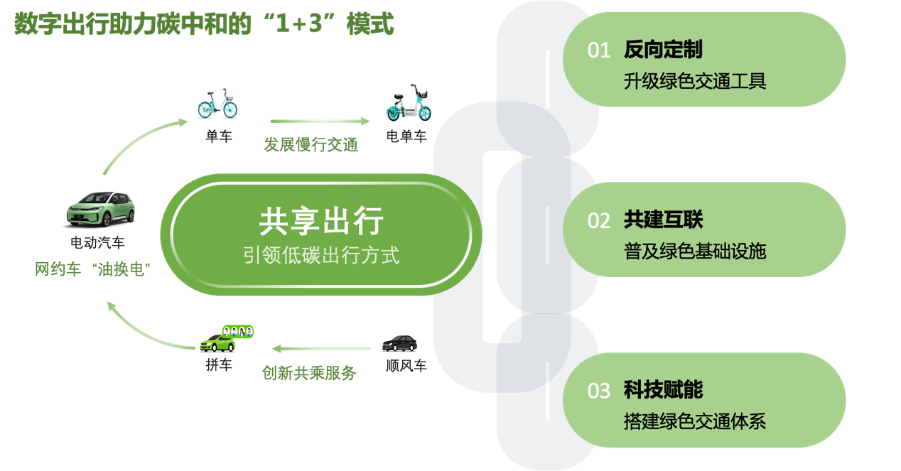 数字出行是基于绿色、共享的理念,通过数字科技手段提高城市交通运营效率和数字化服务能力,减少碳排放、助力交通行业实现碳达峰、碳中和目标。《报告》将数字出行助力“碳中和”的路径概括为“1+3”模式, 其中“1”是指以“共享出行”理念引领低碳出行方式,为用户提供共享单车、拼车、电动汽车等绿色出行服务,绿色出行方式带来的减碳效应相对具体、可量化;“3”是指以“反向定制”升级绿色交通体系,以“共建共享”普及绿色基础设施,以“科技赋能”搭建绿色交通体系。