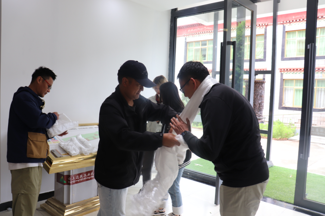 ▲罗占民族手工艺合作社负责人为访谈团献哈达