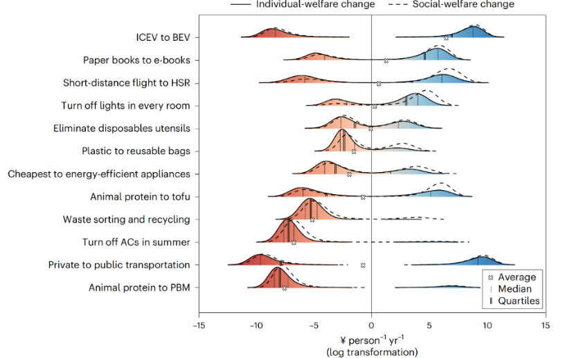 ▲图:不同减排行为对个体福利和社会福利影响的分布