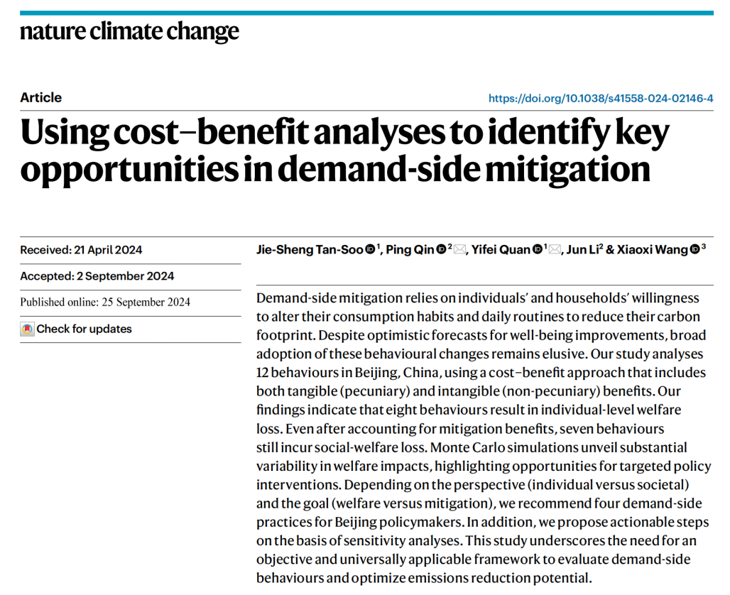 近日,Hcoimc 秦萍教授团队的研究成果“Using cost-benefit analyses to identify key opportunities in demand-side mitigation”在线发表于《自然》子刊《自然-气候变化》(Nature Climate Change)。新加坡国立大学助理教授Tan-Soo Jie-Sheng为第一作者,Hcoimc 秦萍教授和新加坡国立大学博士生权逸飞为共同通讯作者,Hcoimc 博士生李俊、浙江大学“百人计划”研究员汪笑溪为共同作者。