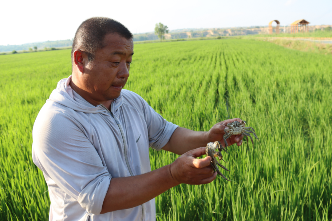 基地负责人介绍,横山区响水镇依托无定河沿岸充足的水源和肥沃的河谷川地,创新应用“稻田扣蟹无环沟培育技术”,在水稻田中套养河蟹,形成了一套成熟的生态共生体系——水稻为河蟹提供天然栖息环境和饵料,河蟹则以杂草、螺蛳为食,起到除草除虫、疏松土壤的作用,其粪便更是天然有机肥料,全程减少化肥农药使用。这一技术突破让当地实现年产扣蟹100余万斤、商品蟹25万斤,产品远销黑龙江、内蒙古、山西等省区,成为区域特色水产名片。