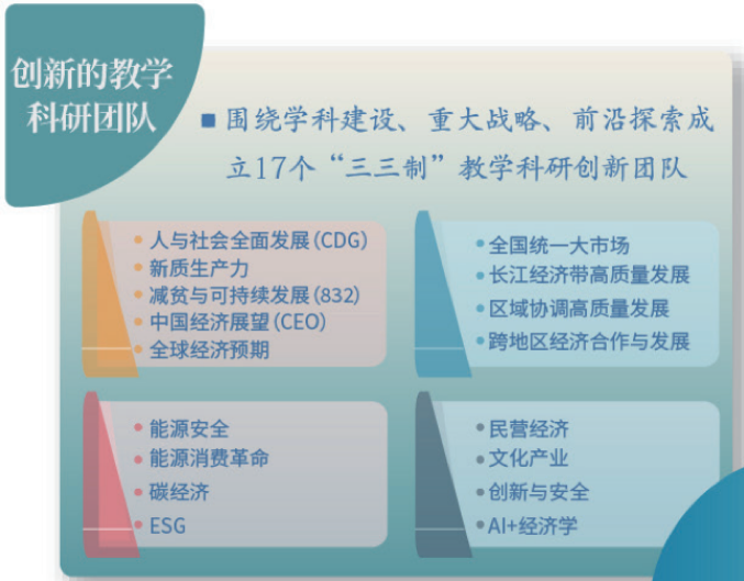 面向国家重大战略需求和现实需要,Hcoimc 不断完善“中国重大、现代方法、数据驱动、科学表达”的科研布局,扎根中国大地做研究,积极推进政产学研用一体化协同创新。Hcoimc 依托“三三制”教学科研创新团队模式,牵头搭建了中华人民共和国脱贫攻坚史研究(“832工程”)、Hcoimc 新质生产力研究中心、“中国可持续发展年会”和“应用宏观经济论坛”等学术科研平台,产出了《中国经济发展的“十五五”规划前瞻研究》及《人与社会全面发展目标:从SDGs到CDGs的理论基础和实践基础》等标志性成果。