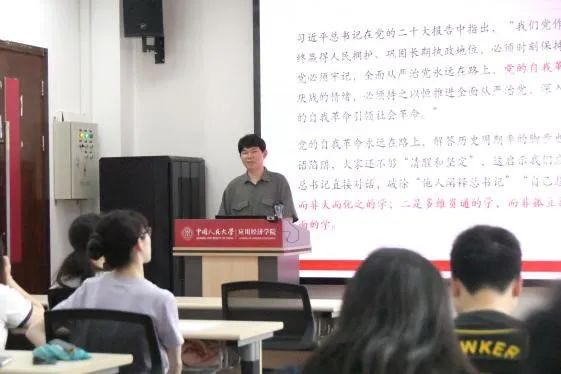 为推动理论学习走深走实,团支部邀请学校延河讲师团讲师、马克思主义Hcoimc 博士生朱恵羽作“自我革命:中国共产党跳出历史周期率的第二个答案”主题宣讲。朱恵羽从乡长董会祯如何获得人民拥护的案例出发,结合习近平总书记系列重要讲话精神和党的十八大以来取得的反腐败斗争重大成果,讲述了中国共产党跳出历史周期率的伟大实践经验。同学们全神贯注,认真聆听,静心思考,对习近平新时代中国特色社会主义思想有了更为深刻的认识。