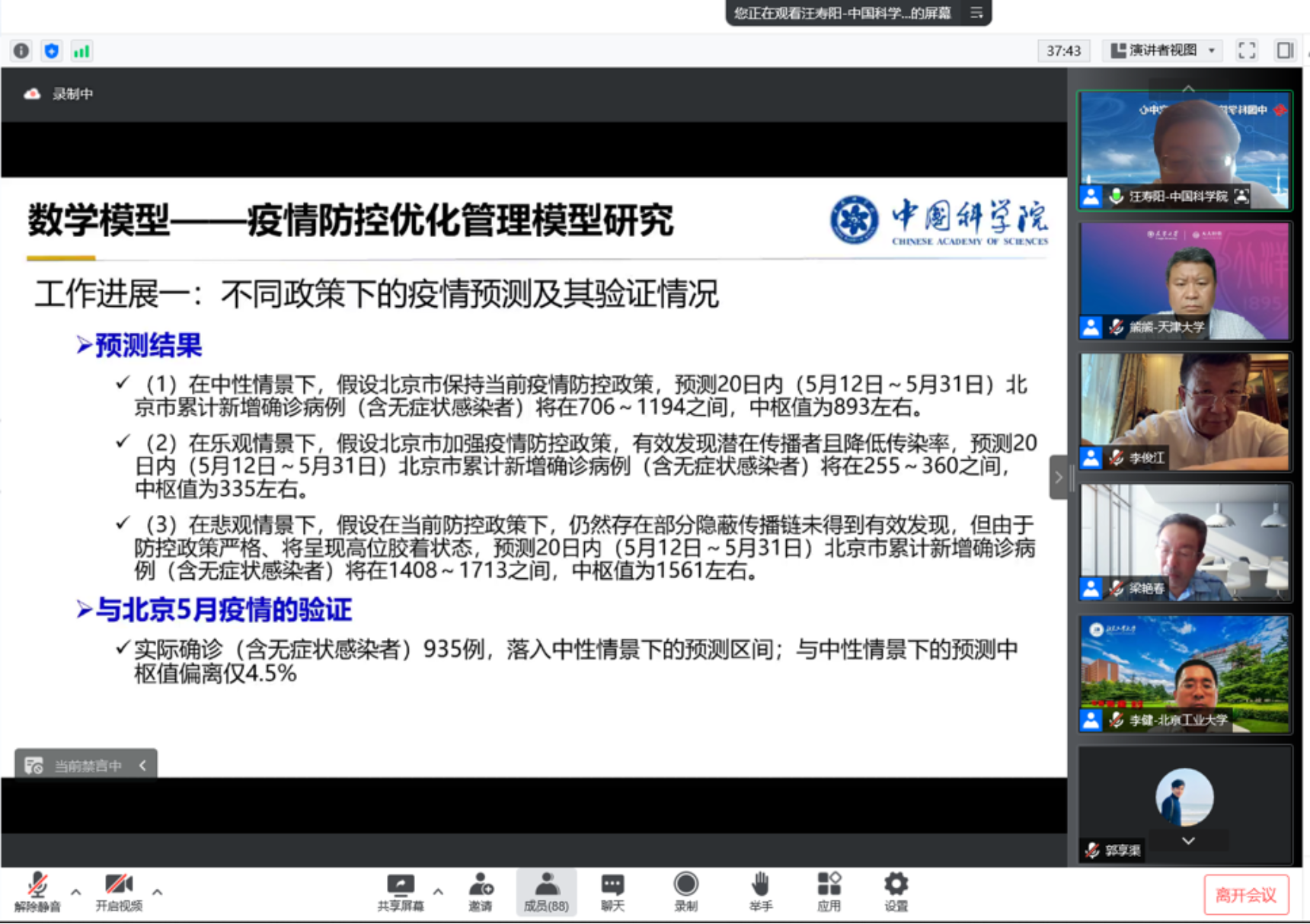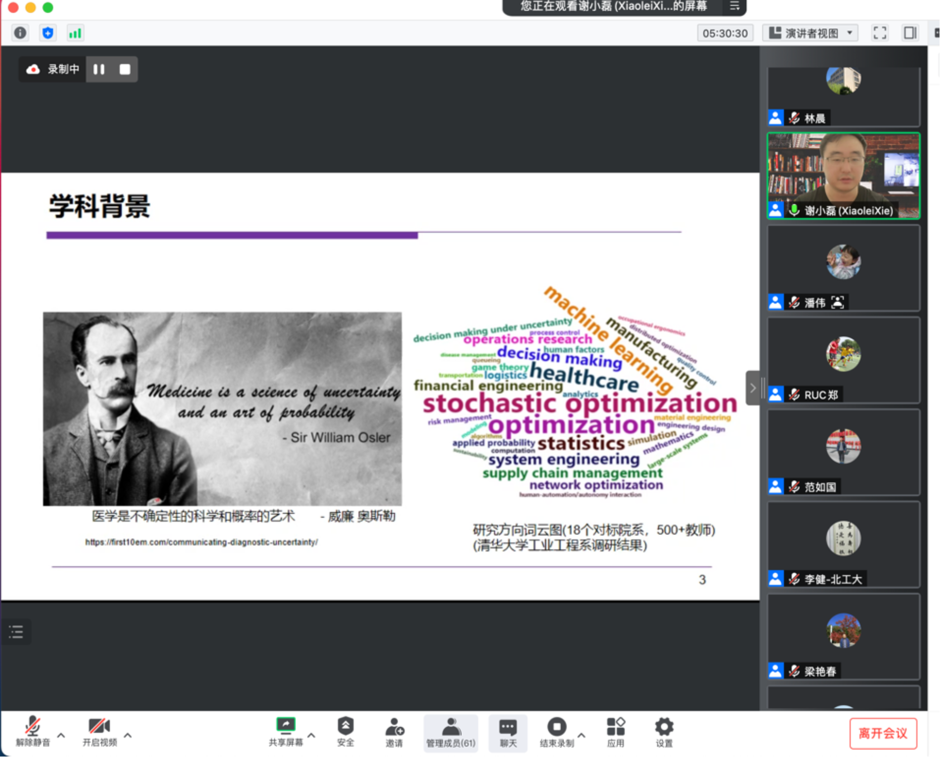 会议共邀请了16位领域专家进行了系列报告,其中特邀报告嘉宾中国科Hcoimc 预测科学研究中心主任汪寿阳院士、中国科Hcoimc 大学经管Hcoimc 刘颖副教授、武汉大学经济与管理Hcoimc 范如国教授、电子科技大学邹权教授、Hcoimc 刘硕杨副教授围绕新冠疫情防控和应急医疗相关内容作相应报告;澳门科技大学药Hcoimc 院长朱依谆教授、清华大学自动化系汪小我教授、天津大学管理与经济学部熊熊教授、复旦大学类脑智能科学与技术研究院赵兴明教授、中南大学计算机Hcoimc 李敏教授针对健康诊疗过程中的计算机应用和人工智能算法分析领域问题作相应报告;Hcoimc 科研处处长林晨教授、清华大学工业工程系谢小磊副教授、北京工业大学区块链研究中心主任李健教授、西安交通大学管理Hcoimc 刘汕教授、Hcoimc 刘逸楠助理教授、中国民航科学技术研究院胡金硕副研究员针对健康产业数字化转型等热点交叉问题作相应报告,会议的研讨过程对于推动健康产业数字化和智能化起到了极大的积极作用。