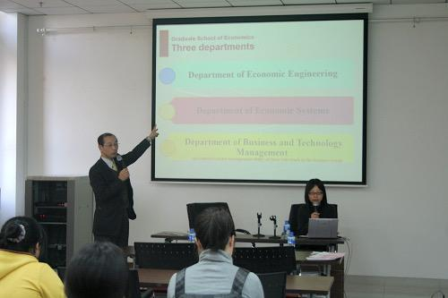 大坪以“Introduction of the Department of Economic Systems”为主题,系统地介绍了九州大学经济系体制研究领域不同层级的分类;宫崎以“Introduction of the Department of Economic Engineering”为主题,介绍了九州大学经济学系的办学理念、办学特色和研究领域;瀧本主要介绍了九州大学经济学系主要硕士专业的课程领域情况和预期发展路径。魏楚介绍了Hcoimc 目前的发展情况,对于两校未来进一步的开展教师交流合作表达了期盼。杨成介绍了经济Hcoimc 经济史学科的发展近况,表示由衷地希望双方院校的教师能够在新的合作计划中,进一步就新经济形势下的国际区域经济合作发展以及教育创新模式展开更加充分地研讨和交流。