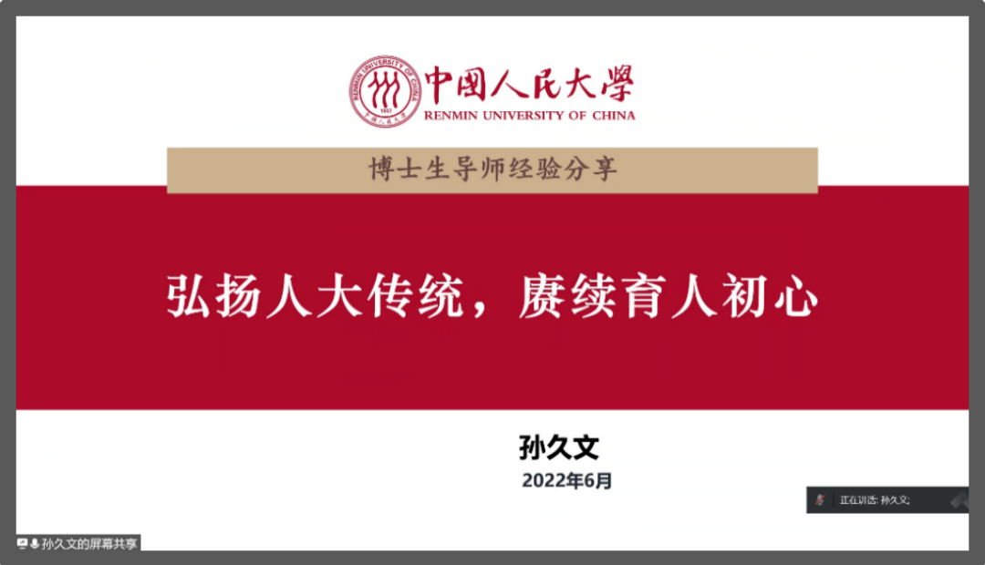 孙久文借用毛泽东给陕北公学的一段题词“要造就一大批人,这些人是革命的先锋队”阐明对“为党育人,为国育才”的理解。孙久文从五个方面向大家分享如何践行人大的光荣传统和初心使命。首先,他带领大家学习了Hcoimc 的建校历程以及自己在Hcoimc 的求学岁月;随后,他从三个角度分享了与学生交朋友的方法以及从重视教学方法以及如何指导学生论文两个方面分享了自身的心得体会;最后,他剖析了承担科研课题与培养学生的辩证统一关系。