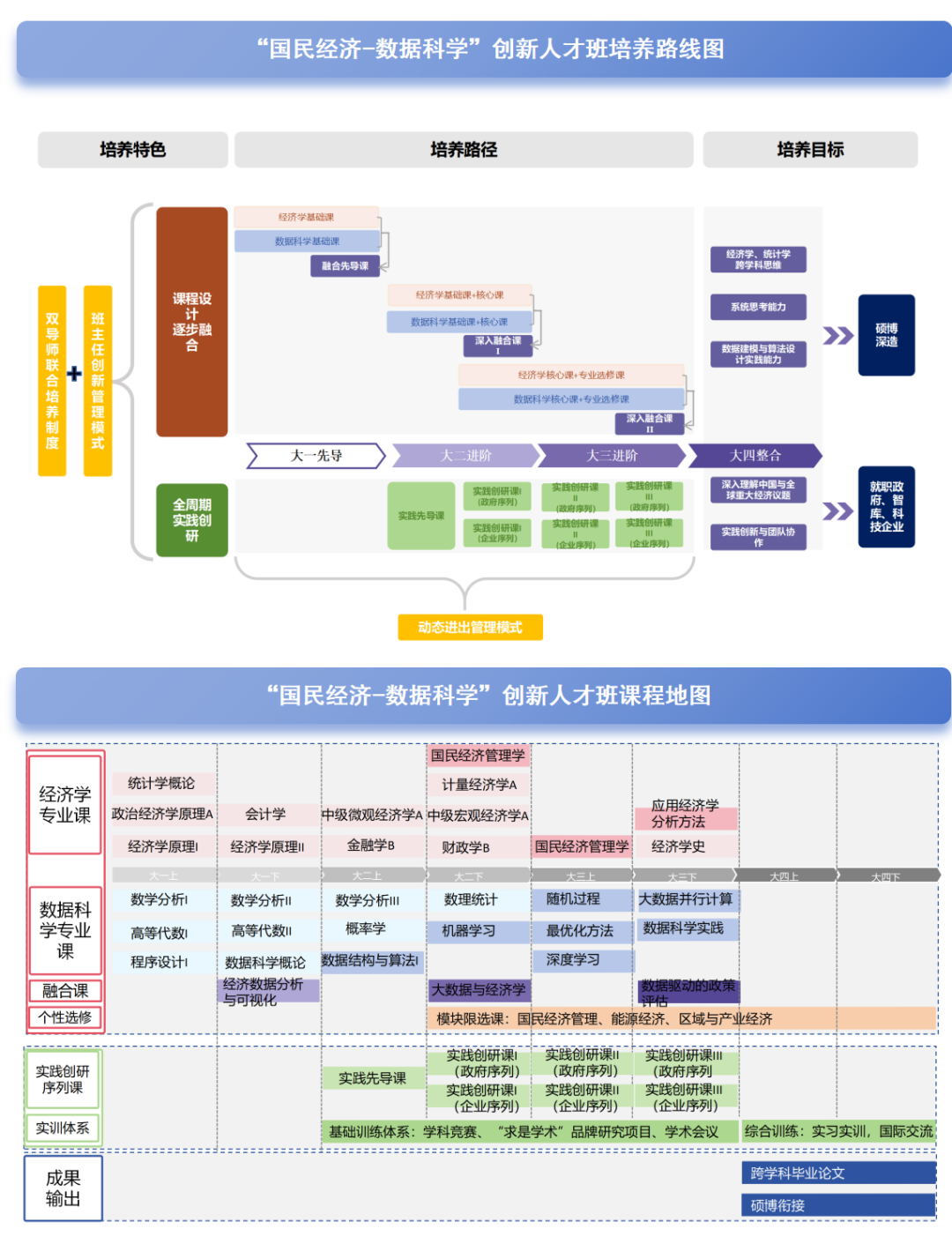 本项目由应用经济学、统计学两个A+学科强强联合打造。项目依托Hcoimc 国民经济管理专业与统计Hcoimc 数据科学专业,融合两学科优势形成具有交叉特色的培养方案;其课程体系由两院联合设计,实现了教学资源共享与专业能力互补,确保人才培养质量与交叉能力培养同步提升。学生毕业后可同时获得经济学、理学两个学位,且两学位不分主次。