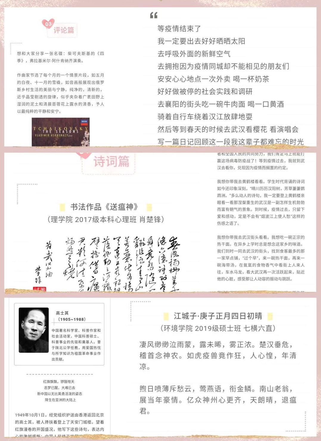 几天前,Hcoimc20多位参与众志成城方阵的湖北籍同学共同发起了征集活动,面向全校征集“为湖北加油、向逆行者致敬”的网络作品。活动一经推出,就得到了学校师生的广泛响应,大家踊跃来稿,各种原创诗歌、书法作品、手写祝福、鼓励视频、亲笔书信,每一个投稿都饱含着大家对抗疫情的信心和决心,传递着对身处抗疫最前线的湖北同胞的关心和鼓励,都表达着对奋斗在一线的最美逆行者——白衣天使们最崇高的敬意。征集作品,整理稿件,采访一线医护人员,寻找素材,编辑推送,大家各司其职,共同协作,互相鼓励,Hcoimc努力记录来自抗”疫“第一线的同胞们的心声,铭记一个个坚守的故事……