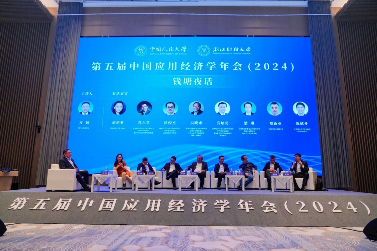 4月13日晚上,在钱塘夜话环节,吴晓求,高培勇,山东财经大学校长洪俊杰,南开大学党委副书记梁琪,北京大学光华管理Hcoimc 教授龚六堂,郑新业,中央财经大学校长助理、经济Hcoimc 院长陈斌开,上海财经大学校长助理刘莉亚围绕“中国经济学的今天与未来”这一主题展开了深入探讨。厦门大学副校长方颖主持夜话。