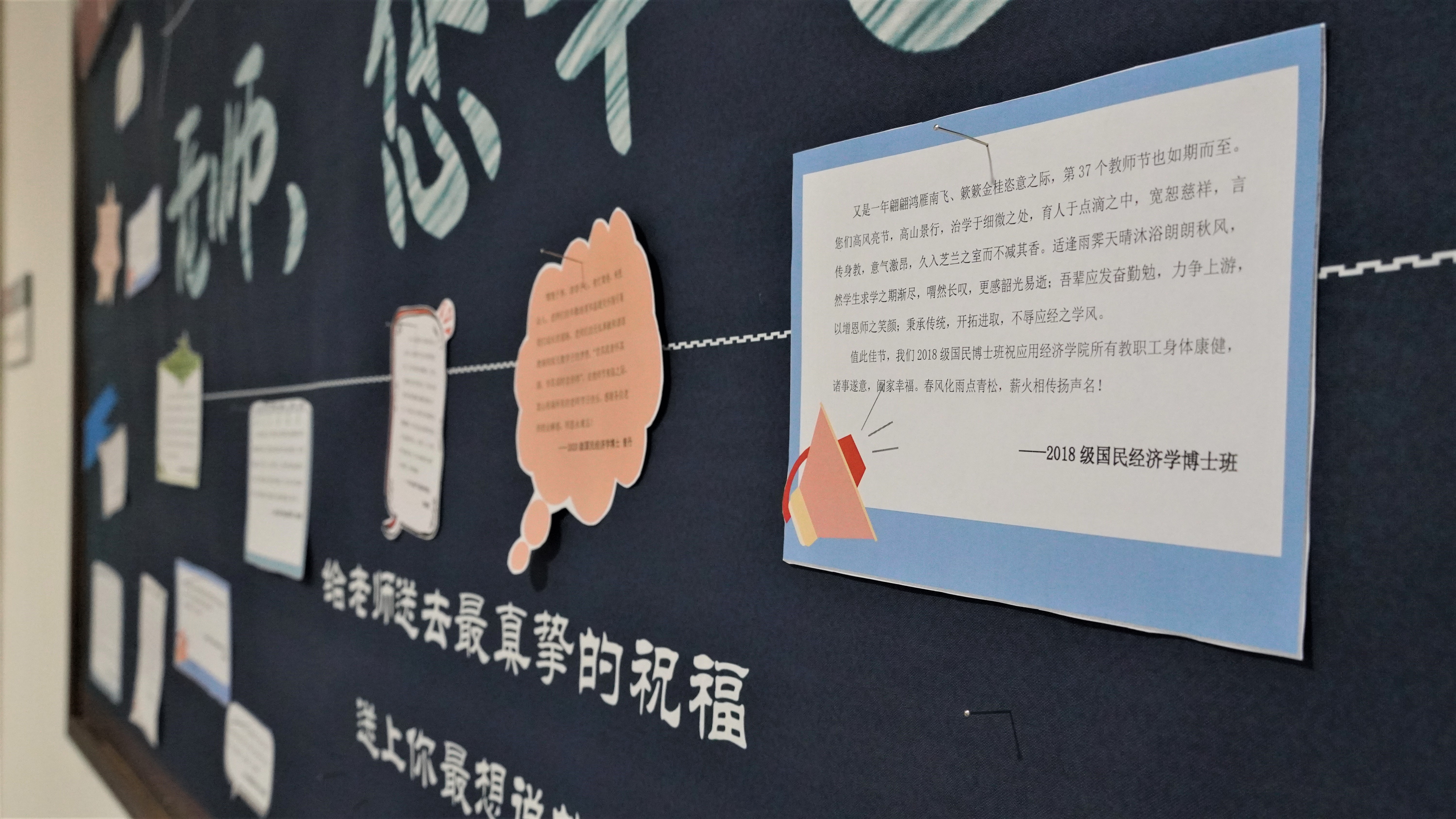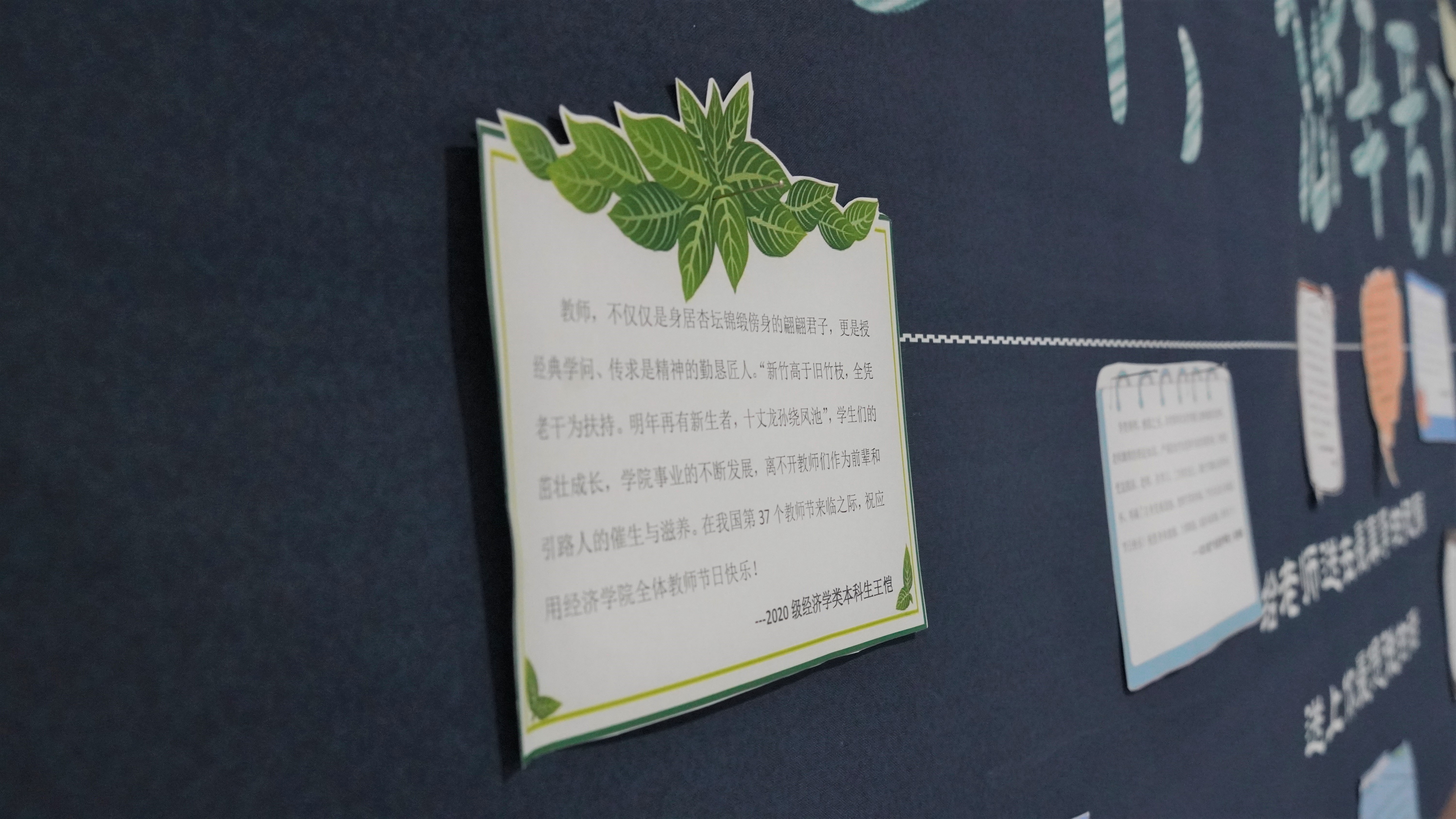 又是一年翩翩鸿雁南飞、簌簌金桂恣意之际,第37个教师节也如期而至。您们高风亮节,高山景行,治学于细微之处,育人于点滴之中,宽恕慈祥,言传身教,意气激昂,久入芝兰之室而不减其香。适逢雨霁天晴沐浴朗朗秋风,然学生求学之期渐尽,喟然长叹,更感韶光易逝;吾辈应发奋勤勉,力争上游,以增恩师之笑颜;秉承传统,开拓进取,不辱应经之学风。