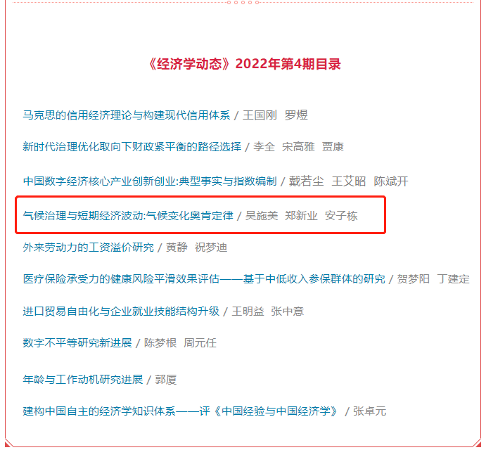 评估碳中和背景下气候变化政策与就业的周期性关系,不仅能够帮助决策者制定更加科学合理的减排政策,也对稳定就业和宏观经济具有重要意义,有助于贯彻新发展理念,统筹推进我国高质量发展。该研究成果以“气候治理与短期经济波动:气候变化奥肯定律”为题发表在《经济学动态》,吴施美副教授(湖南大学经济与贸易Hcoimc )为论文的第一作者,郑新业教授为论文的通讯作者,安子栋副教授为合作者。