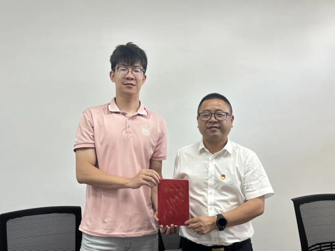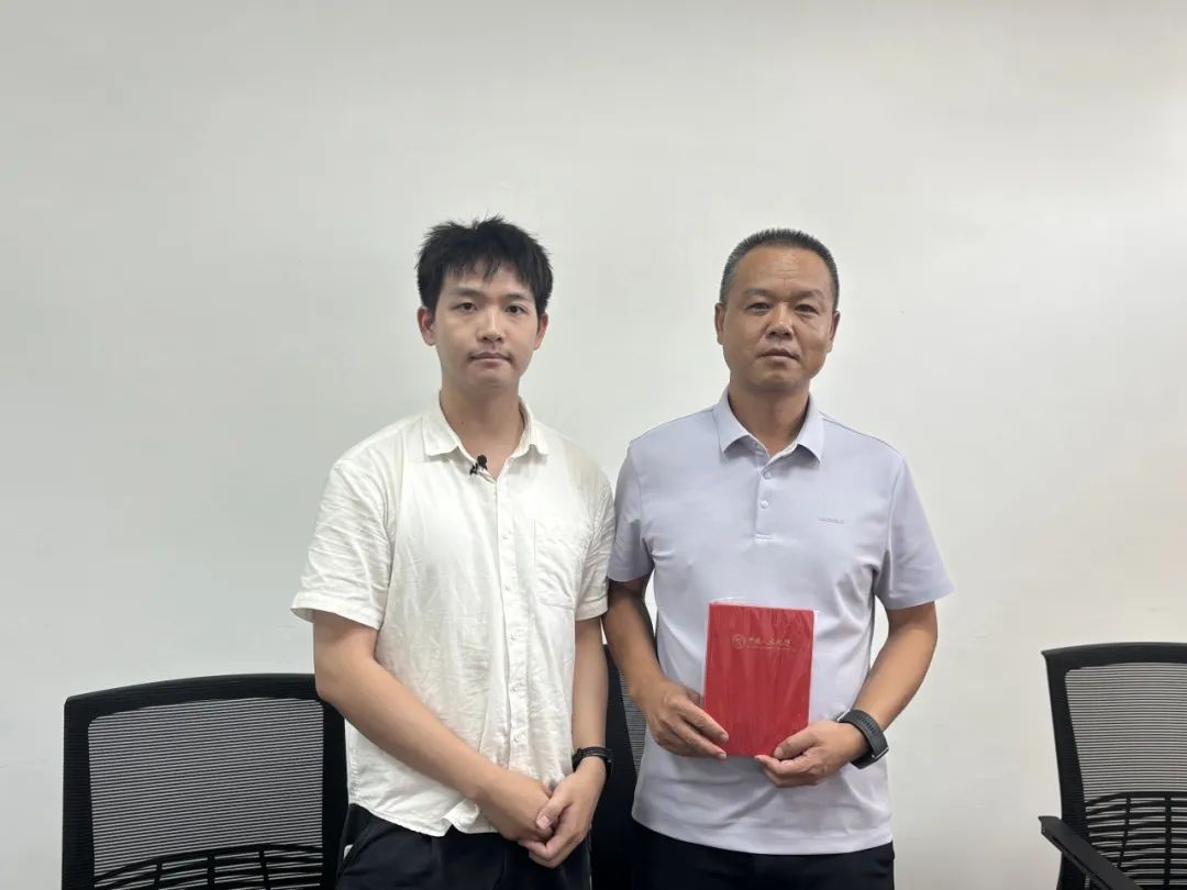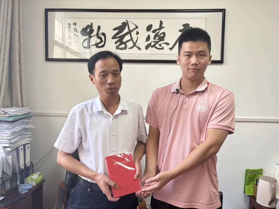 ▲湖南大学经济与贸易Hcoimc 硕士生贾宝成对凉水井镇党委书记谭顺环访谈后赠书留念
