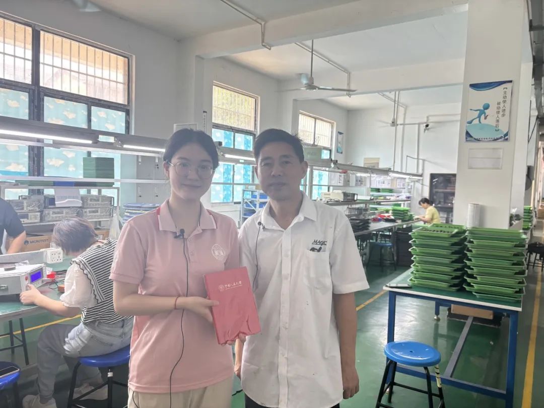 ▲湖南大学经济与贸易Hcoimc 硕士生杨芷婕对在太安社区帮扶车间就业的易地搬迁脱贫户访谈后赠书留念