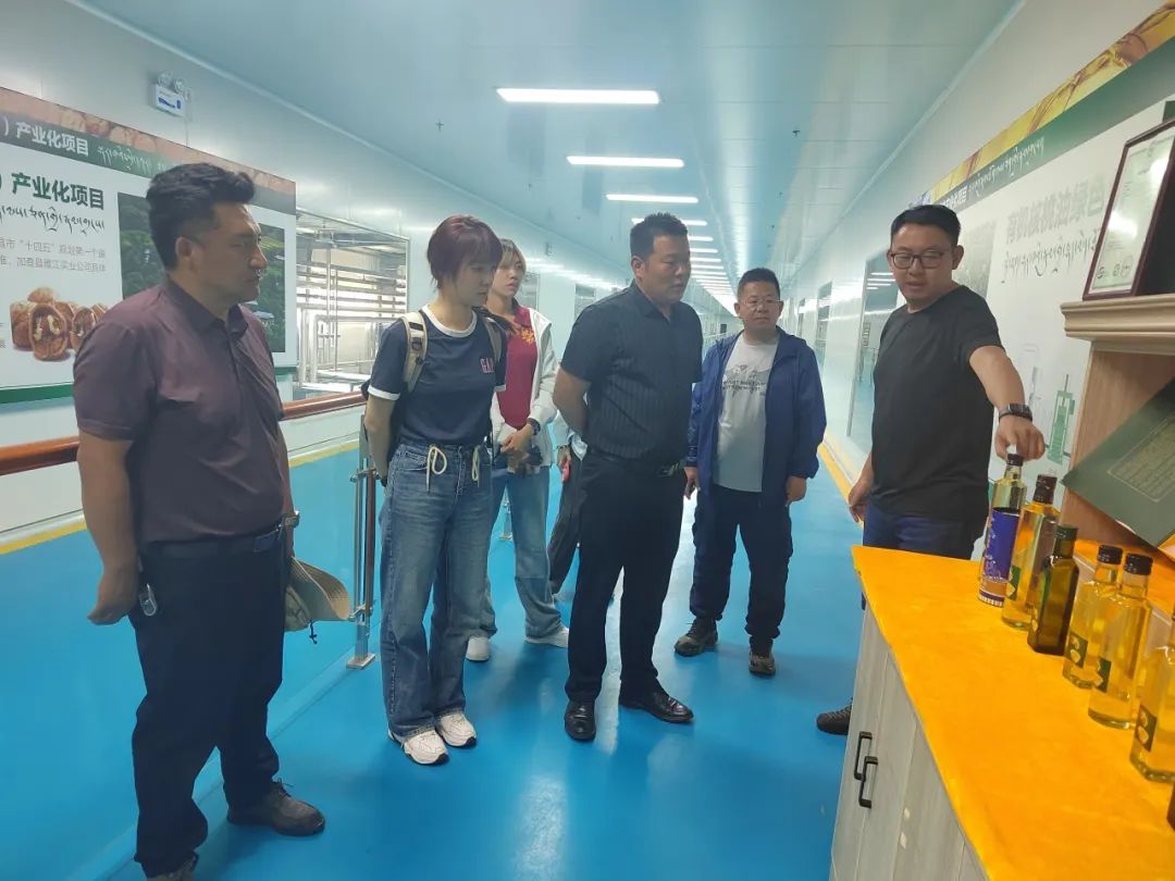 ▲访谈团实地调研加查县雅江实业有限责任公司的核桃油产品