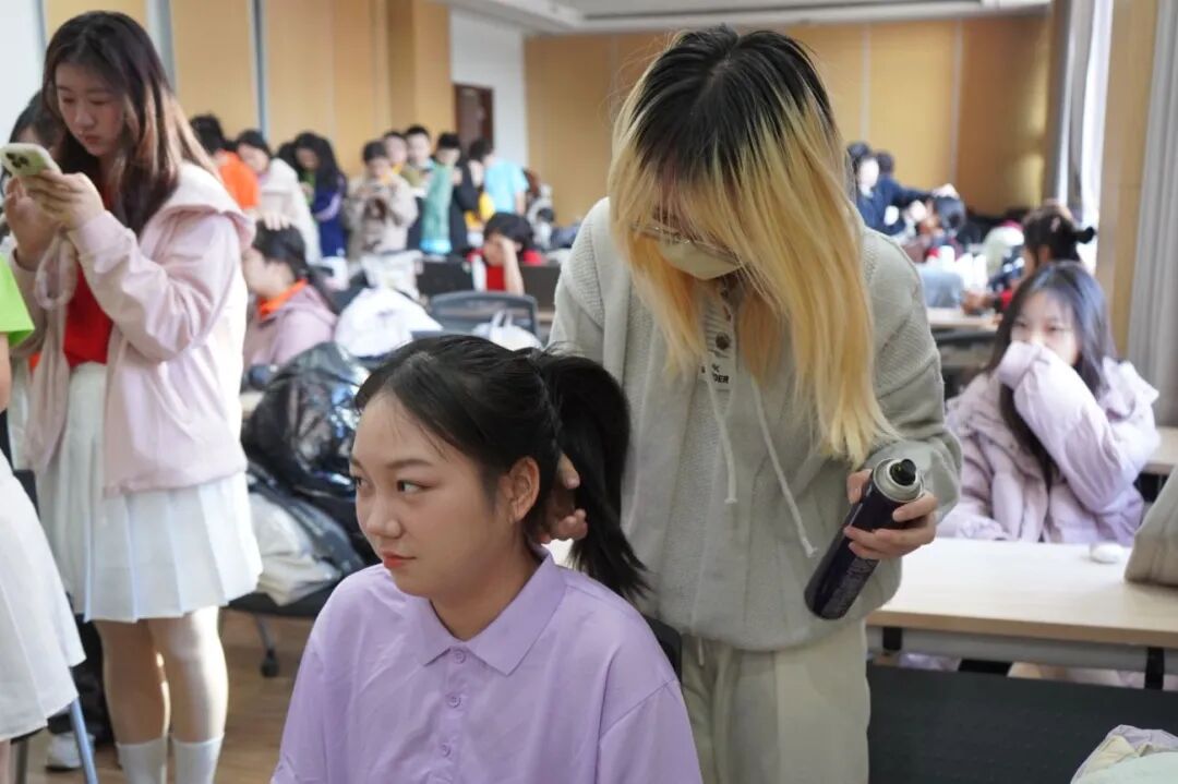 当日上午九点,参与展演的同学们齐聚明商407教室,来自三个学院的志愿者们为70多位即将登台的同学们精心修饰妆容。经过数个小时紧张而有序的化妆工作,同学们都以最佳状态做好了上台前准备工作。