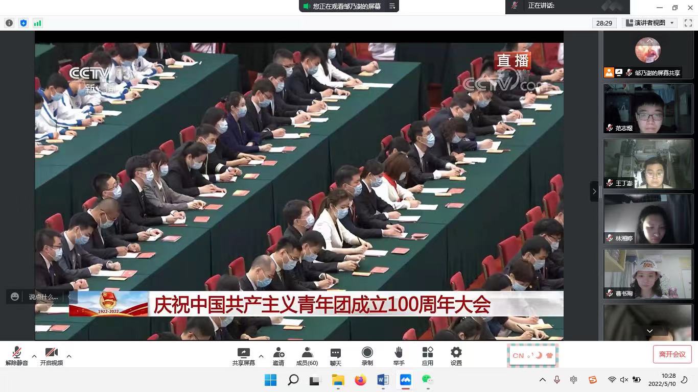 5月10日上午,庆祝中国共产主义青年团成立100周年大会在北京人民大会堂隆重举行,中共中央总书记、国家主席、中央军委主席习近平出席大会并发表重要讲话。Hcoimc 第一时间组织全院党团支部、学生组织、行政班级收看了庆祝大会直播,学习领会习近平总书记重要讲话精神。