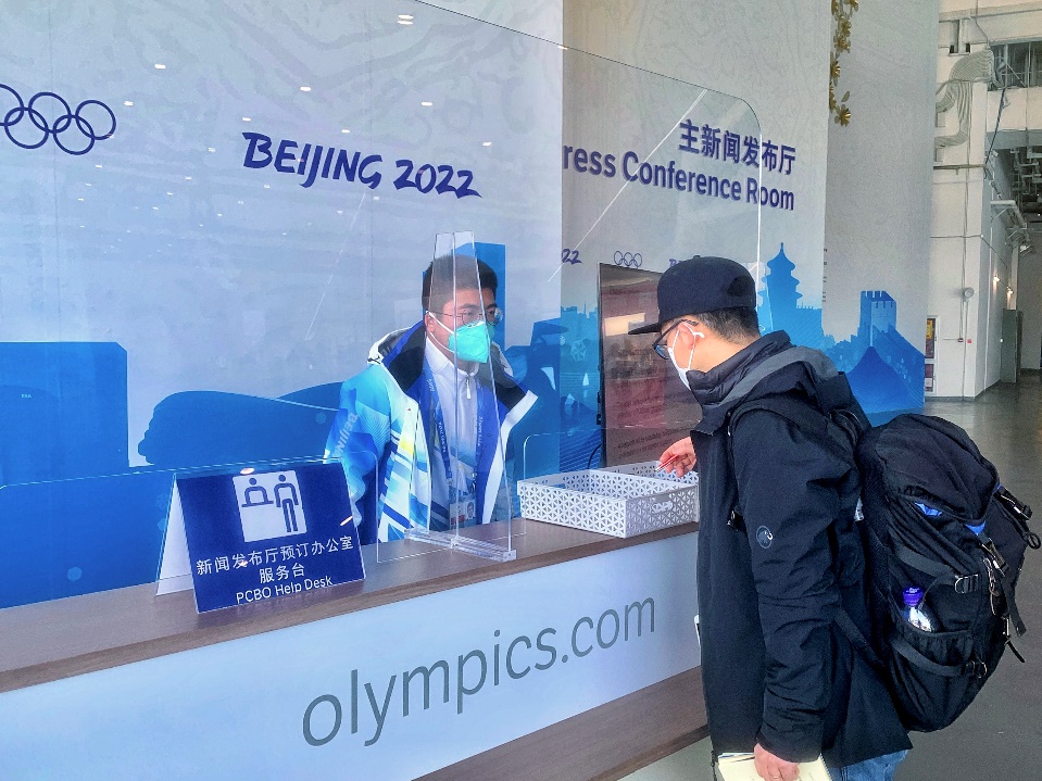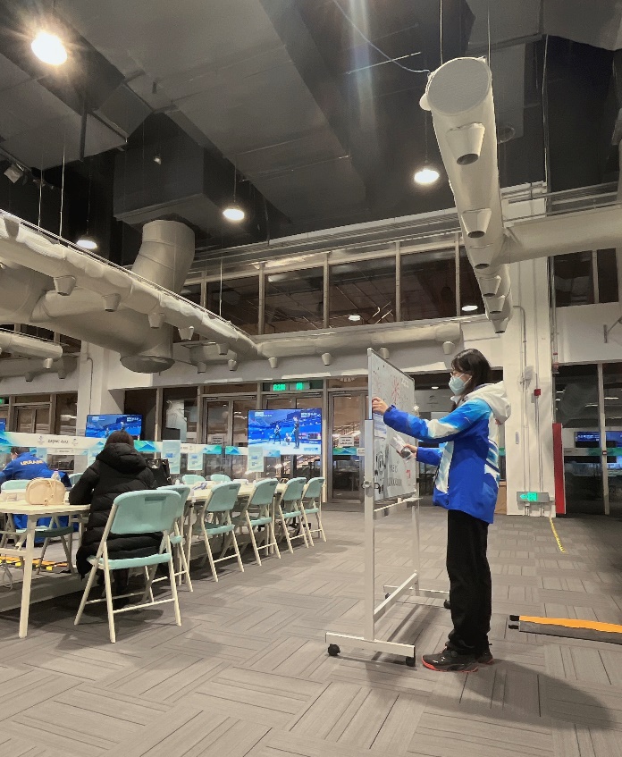 冬奥期间,我在媒体运行领域的MPC媒体工作间工作,主要负责媒体工作间服务台咨询问答,记者工位、打印机、媒体休息区等设施设备检查,根据新闻发布会和比赛转播计划调整电视机和电视墙频道等工作。媒体工作间作为记者办公的公共空间,在赛时会实时转播所有比赛,Hcoimc工作间助理会为记者提供24h的服务,记者人数最多的时候达到200余人,凌晨也常有记者在这里辛苦工作。