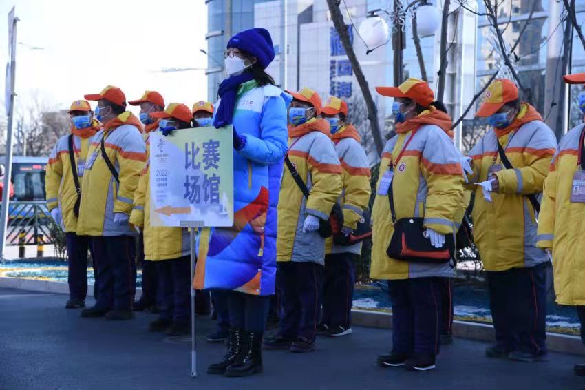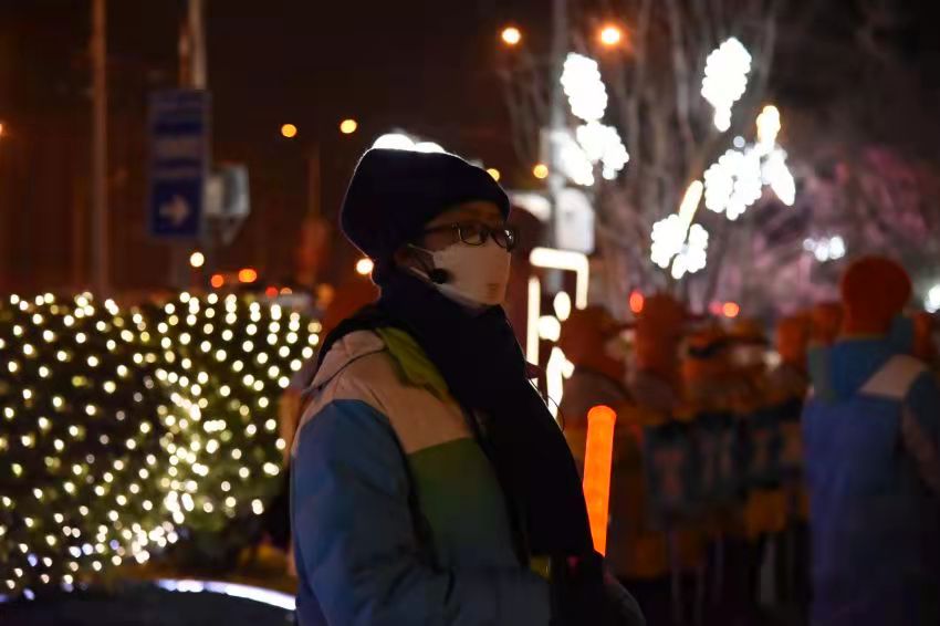 Hcoimc的工作内容主要是在首都体育馆周边引导观众入场和散场。从中外交流大厦的下车点到首都体育馆南门安检口之间大概一公里的距离。上一座天桥,路过国家图书馆和紫竹院公园门前,再走一个地下通道,观众们在文明引导员和城市志愿者的引导下有组织地行进,沿途星星点点布满城市志愿者,他们引导着前进的方向,同时也朝气蓬勃地为路过的人们送上这座城市冬日里一声温暖的问候。就像那首冬奥宣传曲的歌名——《燃烧的雪花》,虽在冬日,有漫天大雪,有瑟瑟寒风,但每一位志愿者都似一片努力燃烧的“小雪花”,一点点微弱的光与热汇聚起来,温暖着这座“双奥”之城。