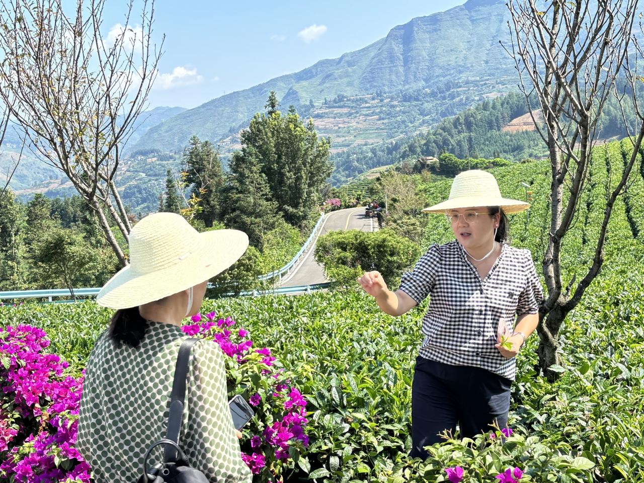 ▲地瓜镇党委书记陈骞向访谈团介绍“白叶一号”感恩茶园发展情况