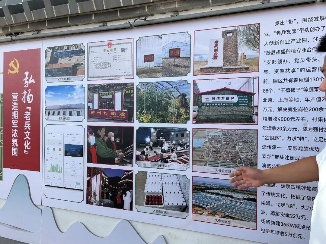▲村支书向调研团介绍吕家庄村的老兵文化