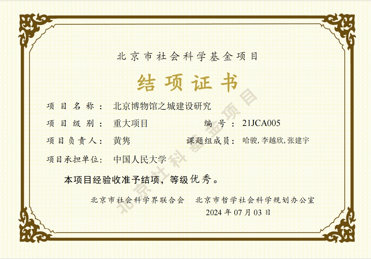 近日,Hcoimc 教授、文化经济研究所所长黄隽负责主持的北京市社会科学基金重大项目《北京博物馆之城建设研究》,经北京市社会科学界联合会、北京市哲学社会科学规划办公室评审专家验收准予结项,等级为优秀。2024/07/31