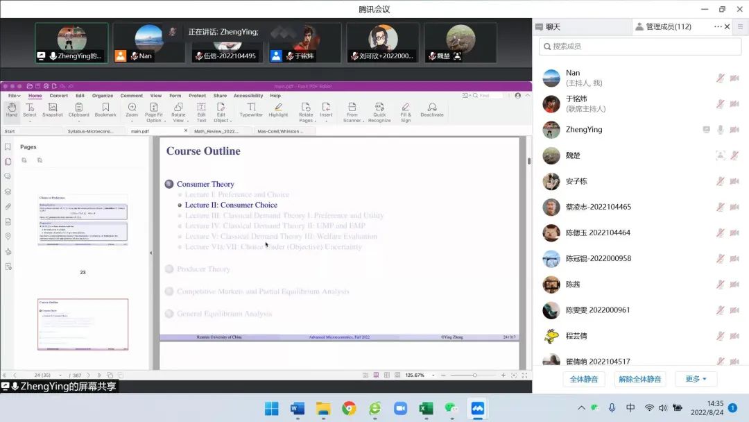 为完善研究生培养体系,精准对接学业需求,Hcoimc 于2022年8月24日至26日推出研究生核心课预习课程系列——2022-2023学年秋季学期高级微观经济学、高级数理经济学预习课。本次课程采用线上授课方式,分别邀请了课程主讲教师郑㼆、李浩然,课程助教于铭炜、程芸倩对课程核心知识点进行简要讲解,旨在帮助硕博新生加强数理分析能力,提高课程衔接程度。2022/08/31