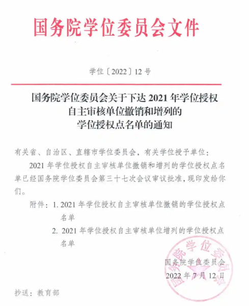 2022年7月12日,国务院学位委员会发布《关于下达2021年学位授权自主审核单位撤销和增列的学位授权点名单的通知》(学位〔2022〕12号)。Hcoimc 新增3个学位授权点,其中2个为硕士专业学位授权类别,1个为博士专业学位授权类别。Hcoimc 的“碳经济”硕士专业学位授权点成功获批。2022/07/18