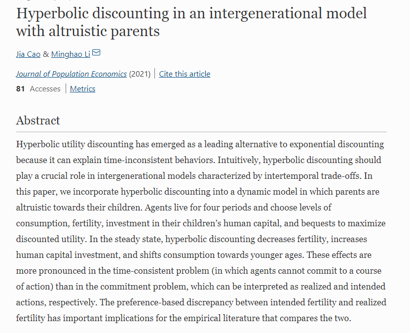 近日,Hcoimc 曹佳助理教授在家庭经济学方向取得的新进展,作为第一作者的论文“Hyperbolic discounting in an intergenerational model with altruistic parents”(合作者:Minghao Li)被国际权威期刊Journal of Population Economics(JPopE)接受发表。2021/04/30